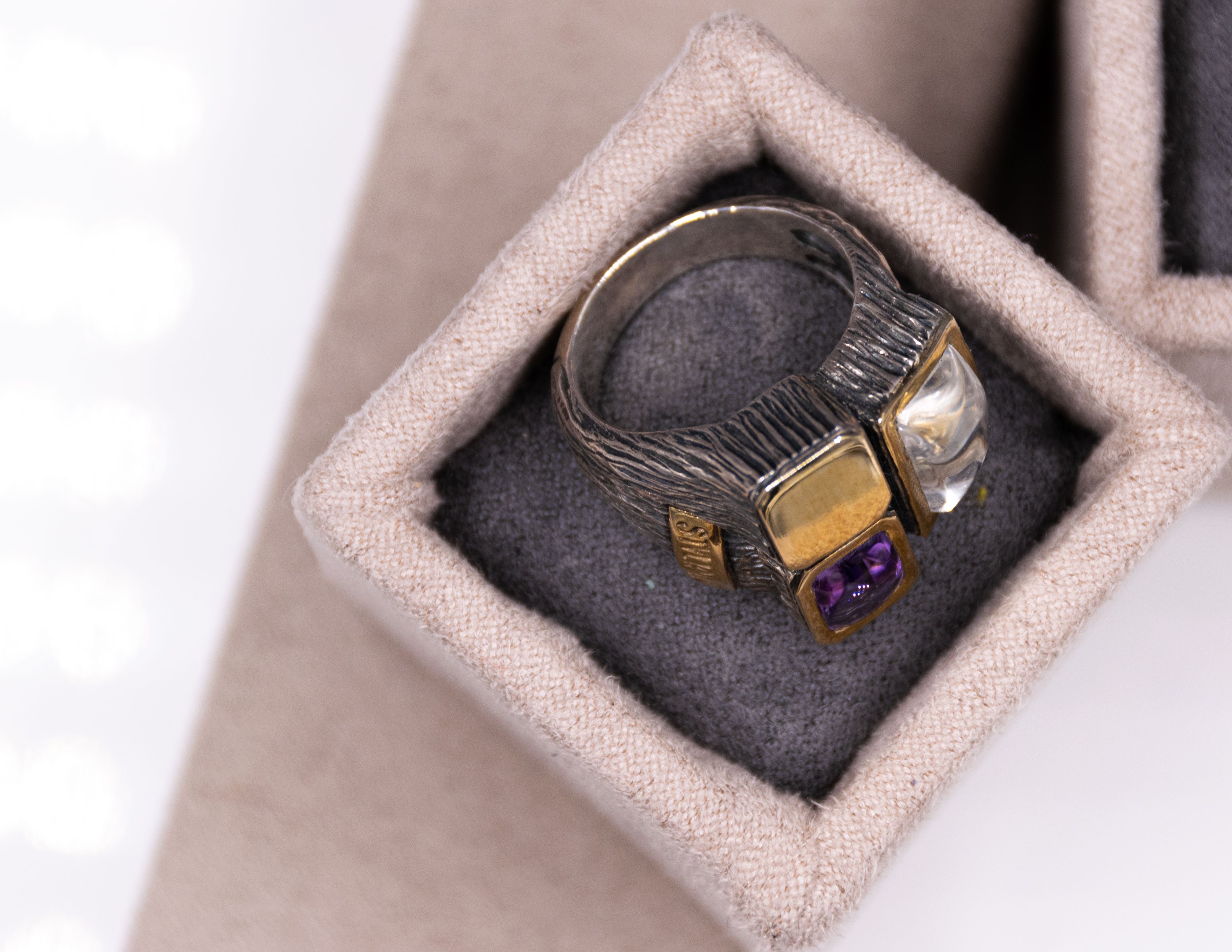 Anillo G.Styliano Plata Oro Cristal de Rocha e Amatista Lila